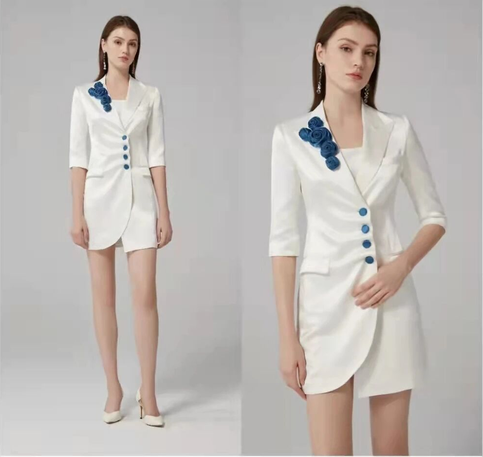 立体花饰点缀:肩部的蓝色立体花朵装饰打破纯白单调,成为视觉焦点,增添法式优雅气质,同时不影响整体专业感。